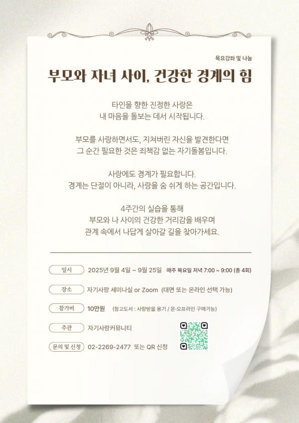 모집마감 [목요강좌] 부모와 자녀 사이, 건강한 경계의 힘 (9월 4일 ~ 9월 25일 / 총 4회)